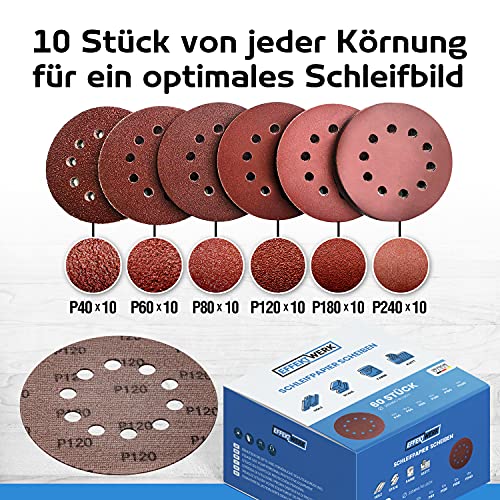 Inhoud: 60 x rond schuurpapier 225 mm klittenband, 10 gaten korrelgrootte: 10 x P40, P60, P80, P120, P180, P240 met 105 mm gatcirkeldiameter.
